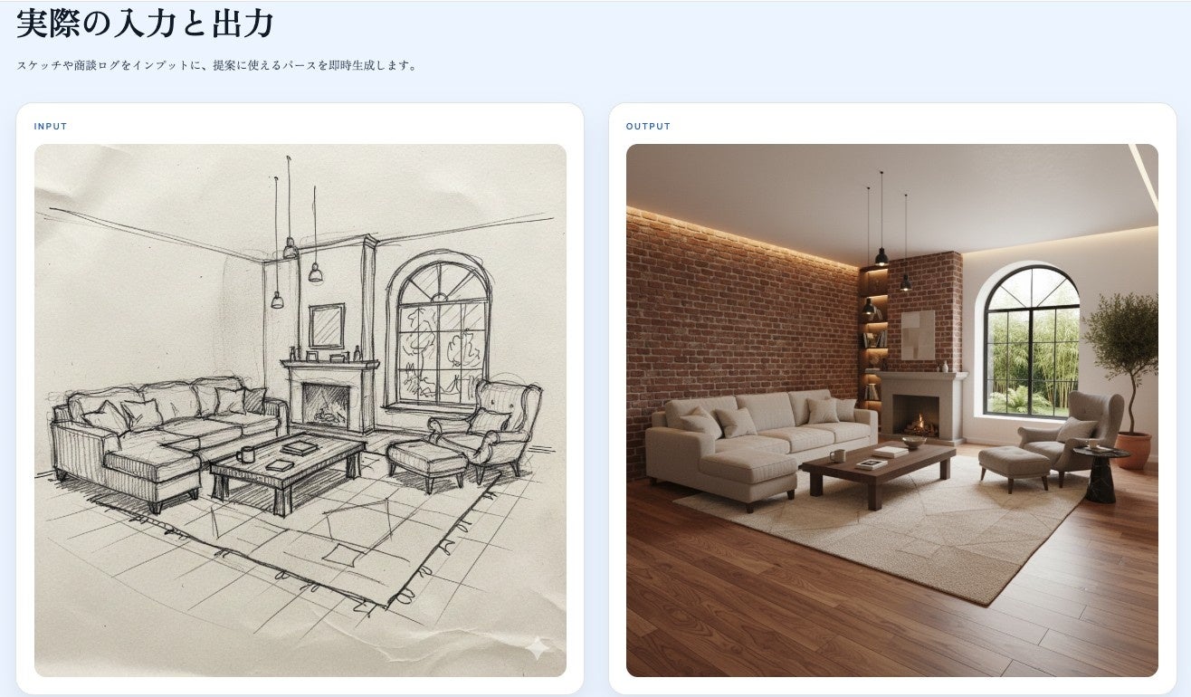 商談で共有された手描きスケッチや口頭での要望から、提案に使用できるビジュアルパース図を自動生成します。