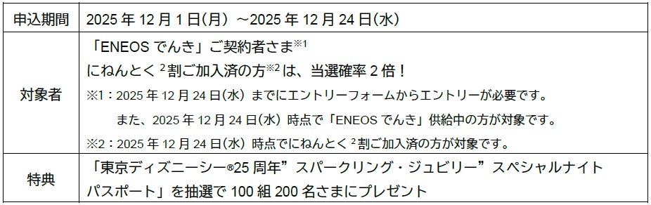 本キャンペーンでは、日頃のご愛顧に感謝を込めて「ENEOSでんき」ご契約者さまを対象に、抽選で100組200名さまに東京ディズニーシー®25周年"スパークリング・ジュビリー"スペシャルナイトパスポートをプレゼントいたします。