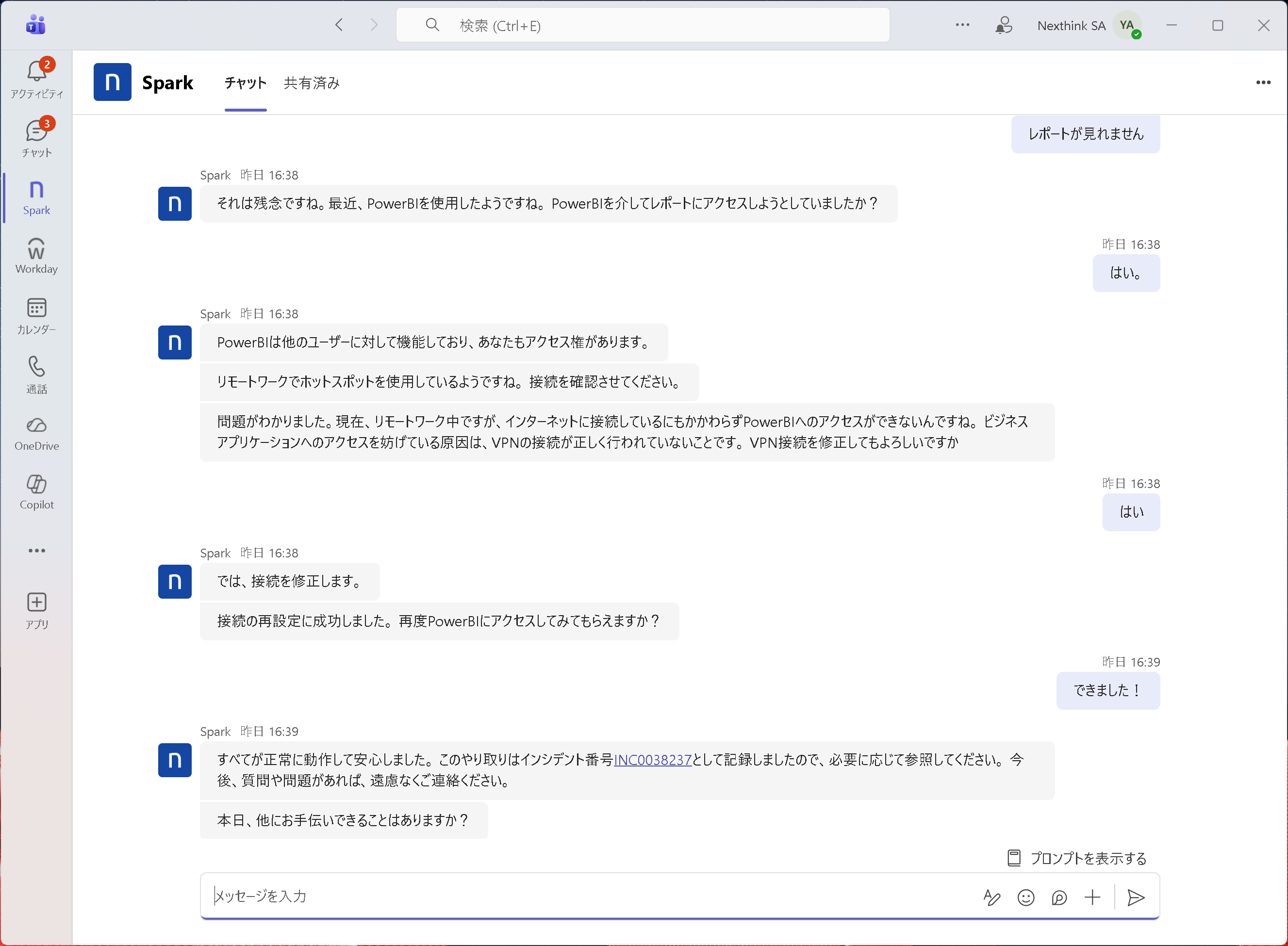 エンドツーエンドの自動化:Sparkは診断アクションと修復アクションを組み合わせ、ITサポート業務を自動化します。パスワード、VPN接続、Wi-Fiなど日常的に発生する一次対応(L1)領域の問題に対し、迅速なトラブルシューティングを実行できます。