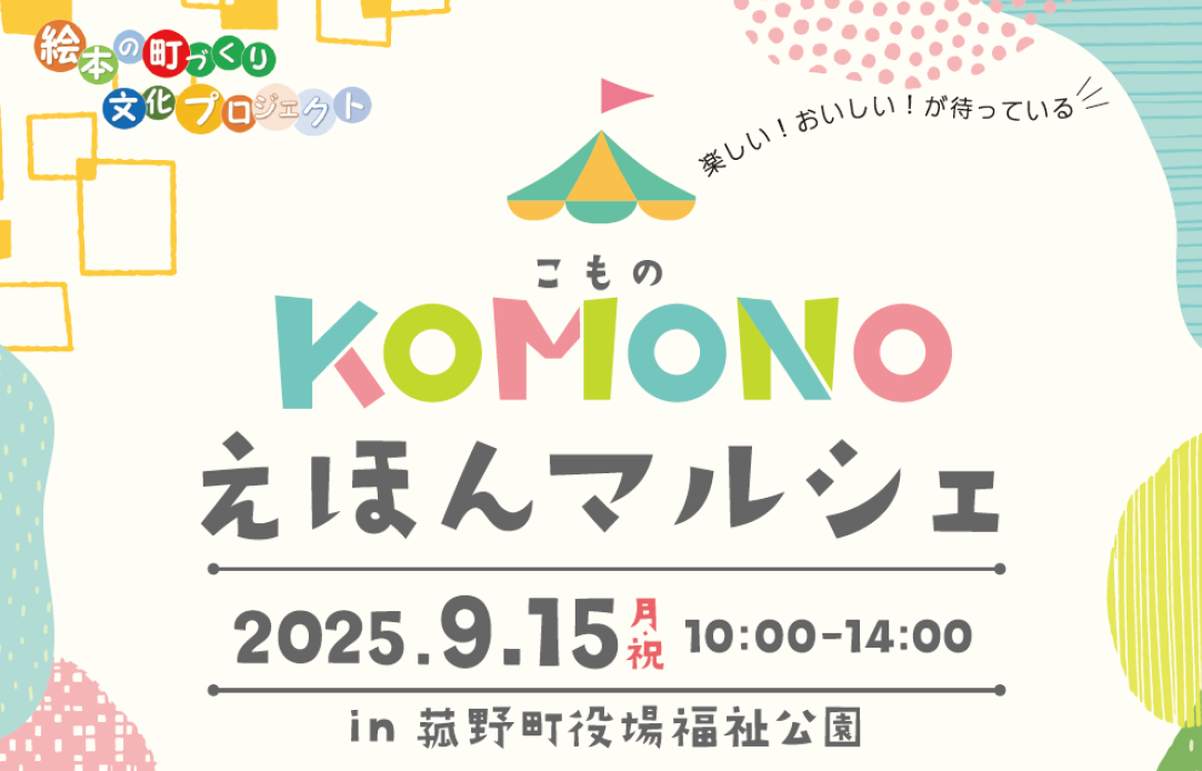 菰野町絵本の町づくり文化プロジェクト実行員会は、令和7年9月15日(月・祝)の午前10時から午後2時まで、「KOMONOえほんマルシェ」を菰野町福祉公園で開催します。