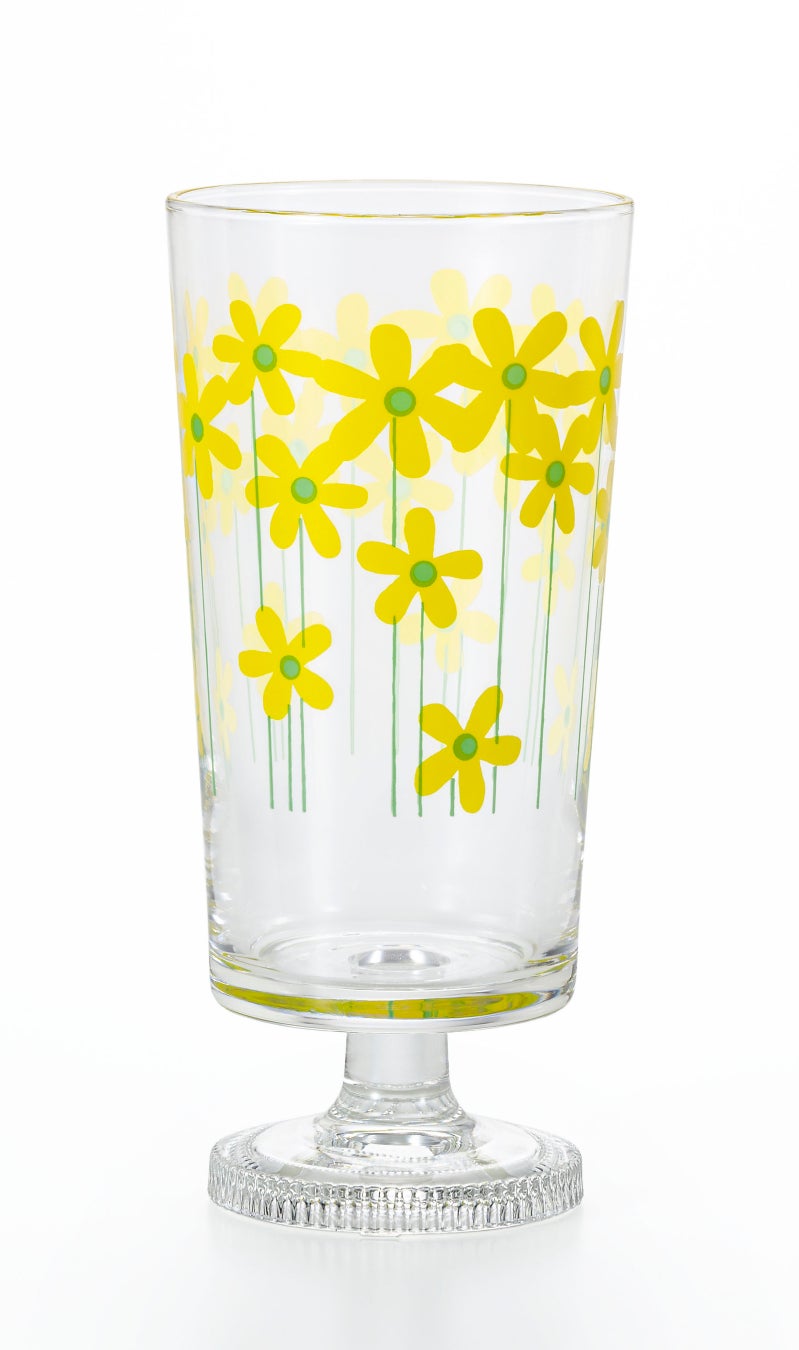 明るい黄色の花々が散りばめられた「純潔」は昭和47(1972)年に発売された柄です。昭和当時は、グリーンのカラーグラス(脚付きグラス)にプリントされていました。お花からすらりと伸びた茎は、すくすくと育っているような元気な印象を与えます。グラスの下から上にかけて花柄の密度が高くなり、グラデーションのような美しさを感じさせるデザインです。