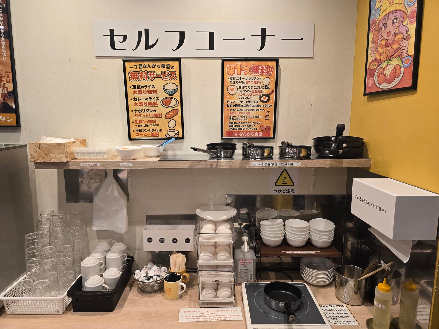 料理をご注文の方には、生卵1つ無料!そのまま生卵でTKGにしてもよし、セルフコーナーではIHコンロとフライパンを自由に使って、目玉焼きやスクランブルエッグが自分で調理できます。「卵を焼く定食屋」というユニークな体験がSNSでも話題に。