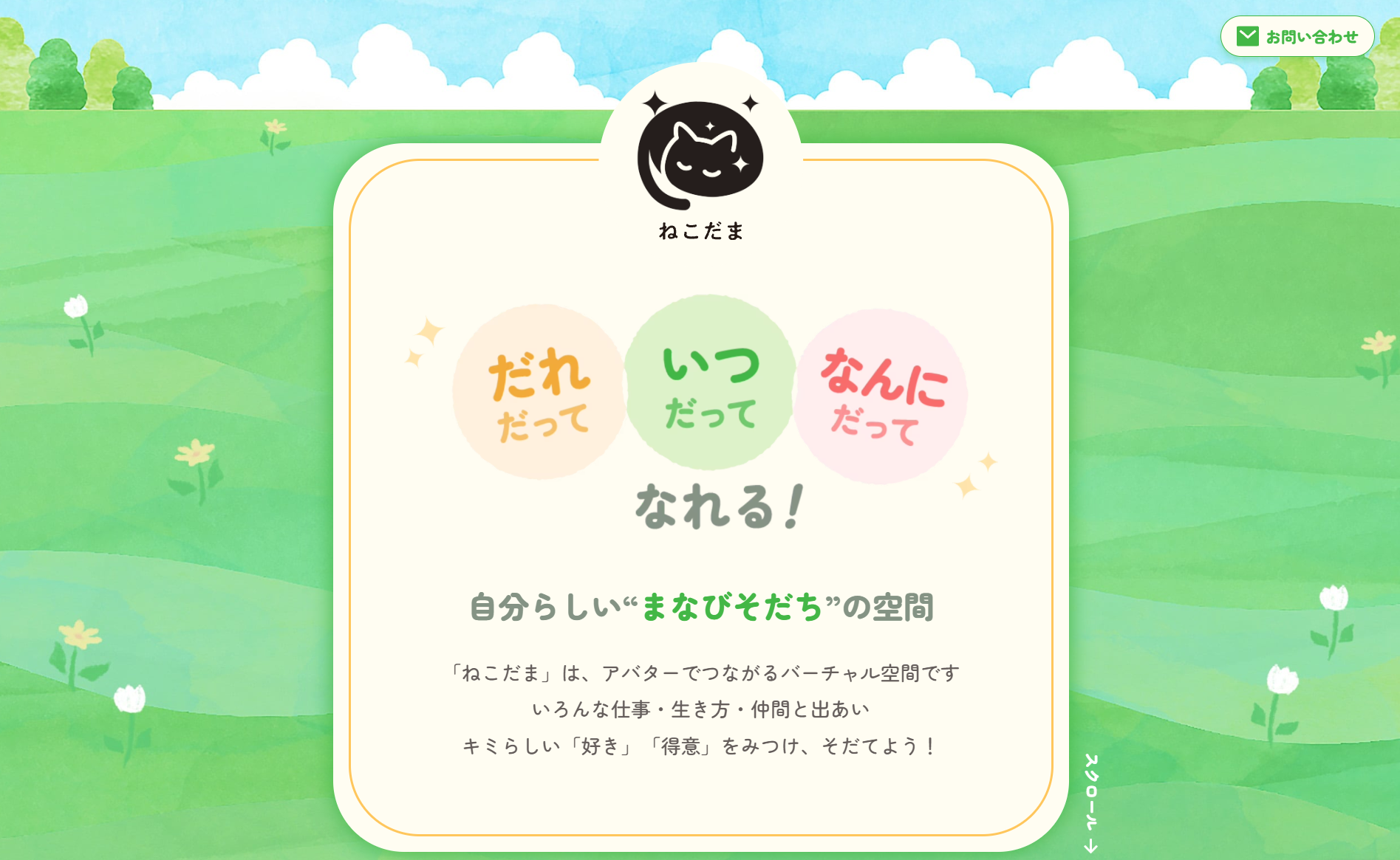 「ねこだま」は、全国の小中学生と地域のおとな(自治体・企業・団体等)をつなぎ、「だれだって・いつだって・なんにだって・なれる!」という”こどもたちのはかりしれない力が瞬きだす”ことを目指しています。それぞれに自分らしく”まなびそだつ”ことのできる空間づくりで、こどもたちのあしたをともにあけていけるよう推進してまいります。これからのこどもたちと社会のあしたが輝くことを願い、ともに想いを寄せてくださる有志の応援も集めながら、一緒に成長を重ねていく所存です。