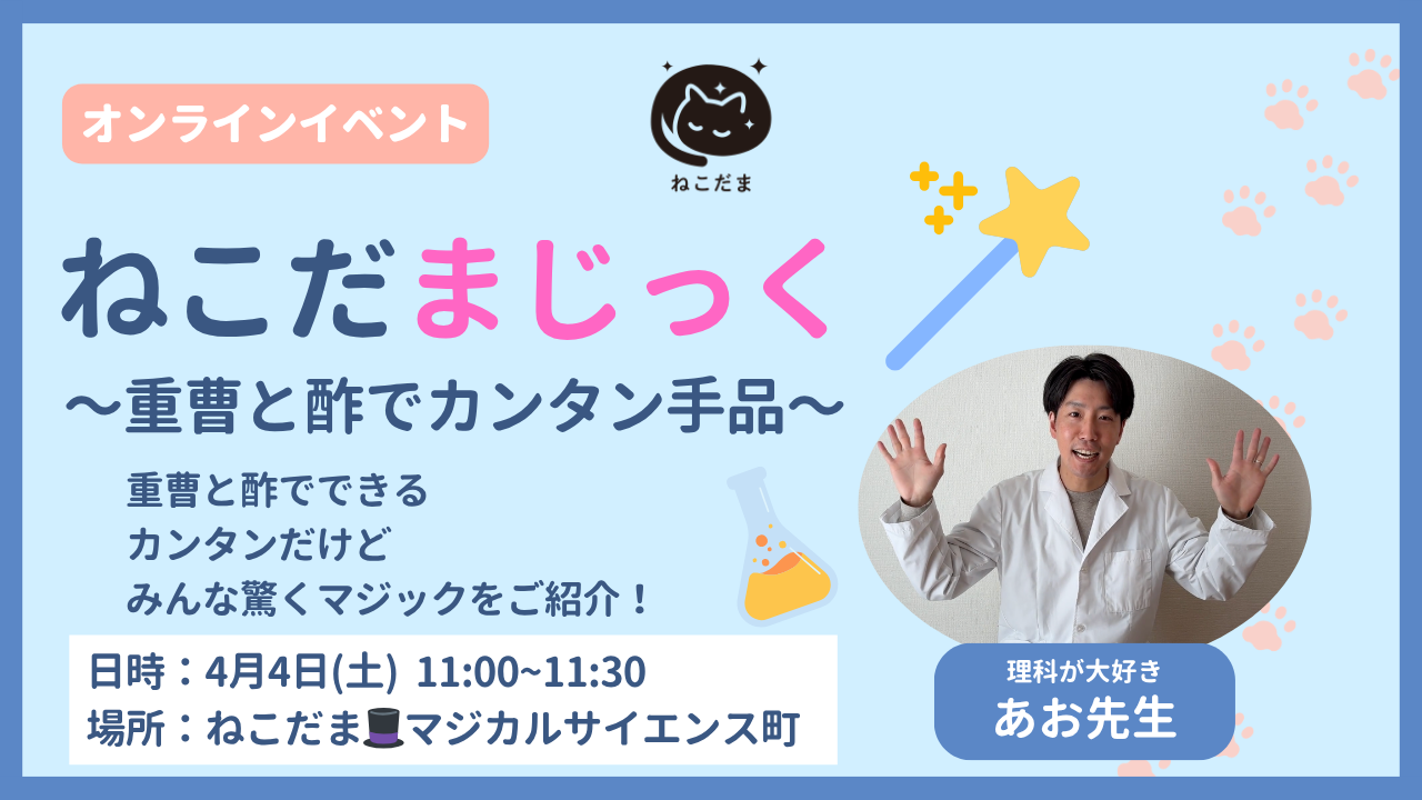 あたらしい”まなびそだち”の場「ねこだま」を展開する株式会社旦(社名:あけがた、本社:東京都世田谷区、代表取締役:澤田浩二)は、春休み期間中の小中学生を対象にオンラインイベントを開催します。来る4月4日(土)午前11時-11時30分、理科が大好き「あお先生」による、”重曹と酢でカンタン手品”をオンラインイベント会場「ねこだま🎩マジカルサイエンス町」でライブ中継します。その場でできるマジックや、まなびを持ち帰って自分で後日できることなど、手品で楽しく”あそび・まなぶ” &「あお先生」に直接質問もできるオンライン交流です。こどもたちの”好き””やりたい”といった気づきと刺激になる”まなびそだち”の機会を提供します。