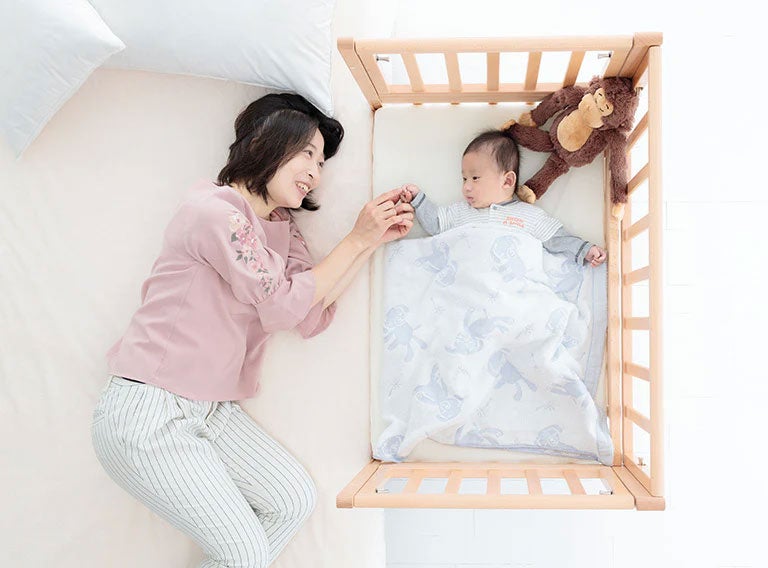 私はこのベビーベッドを実家で使っています。気に入っているのは、大人のベッドにぴったりくっつけて添い寝ができること。実家にはまだ私が使っていた大人用のベッドが残っているので、そのベッドとくっつけて使っています。