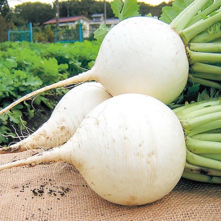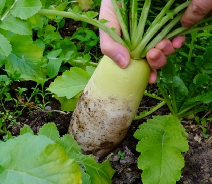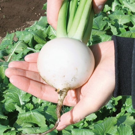 煮物が抜群に美味しい!京野菜の代表種、丸形ダイコン。青首の丸球で、す入りは遅いです。肉質はきめ細かく、甘みがあります。