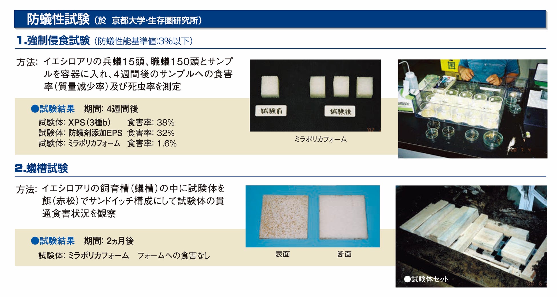 マツミハウジング株式会社は、株式会社JSPが開発した断熱材、「ミラポリカフォーム」を採用しました。「ミラポリカフォーム」はポリカボーネイトを発泡させて作られた断熱材で、シロアリの食害を受けないことを目的として開発されました。京都大学 生存圏研究所の実験でも、シロアリの食害を受けないことを証明されています。