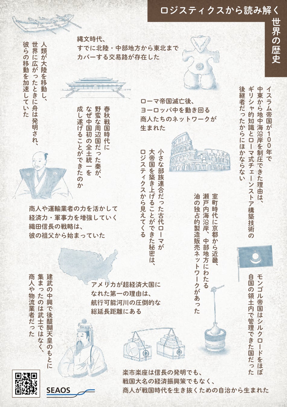 なぜ、小さな部族連合だったローマが大帝国を築けたのか? なぜ、織田信長は天下統一に近づけたのか? なぜ、アメリカは超経済大国になれたのか?これら歴史の転換点には、常に「人・モノ・情報」を動かす仕組み、すなわちロジスティクスの革新がありました。