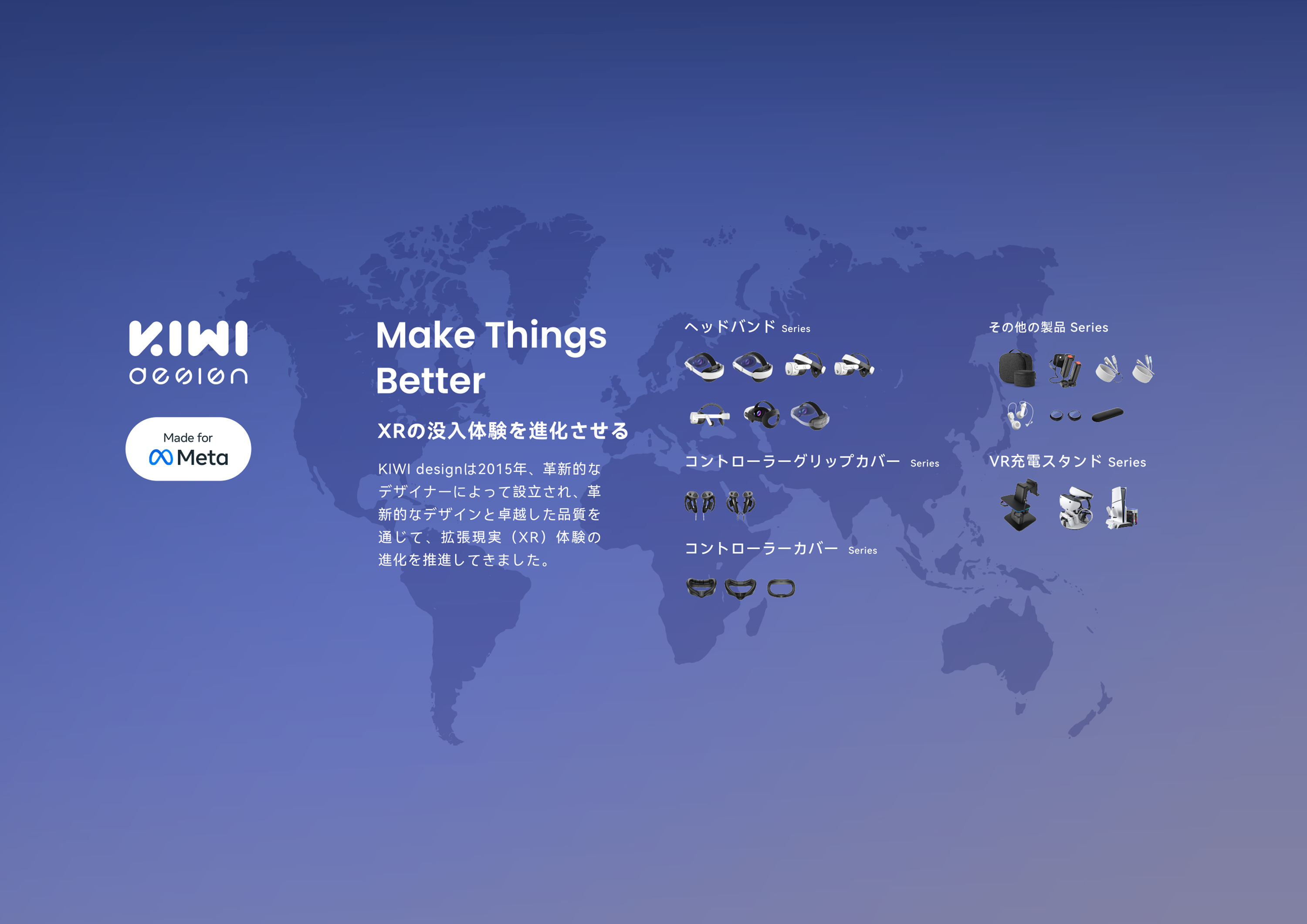 KIWI design は、XR/VRヘッドセット用アクセサリーの分野に特化し、快適性・機能性・品質を重視した製品設計を通じて、より安定した没入型体験の提供を目指しています。現在、KIWI design はグローバル市場において成熟した製品ラインアップとサプライチェーン体制を構築しており、主要なXRデバイスプラットフォームに対応した製品を展開。多くのユーザーおよび業界関係者から高い評価を得ています。