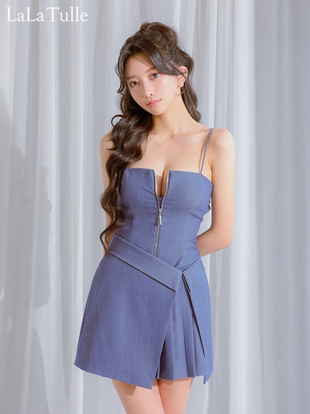 ボディラインを強調するタイトなシルエットに、深みのあるブルーが知的な印象をプラス。