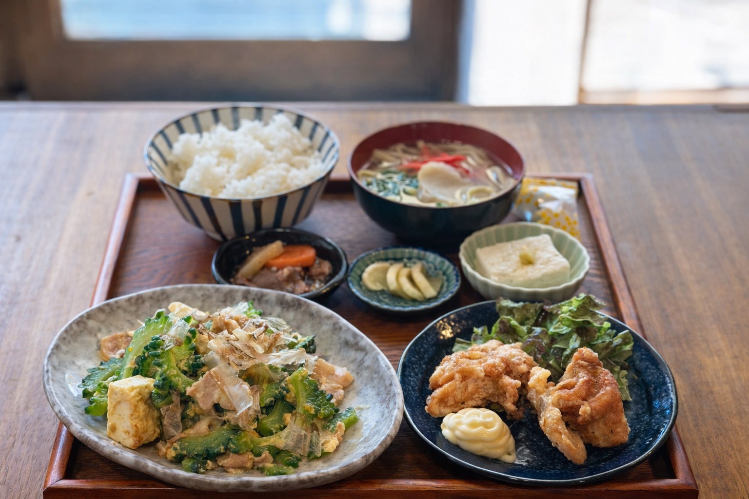 ゴーヤーちゃんぷると唐揚げ定食(サラダ、お新香、小鉢2個、ミニそば、ちんすこう):950円(税込)
