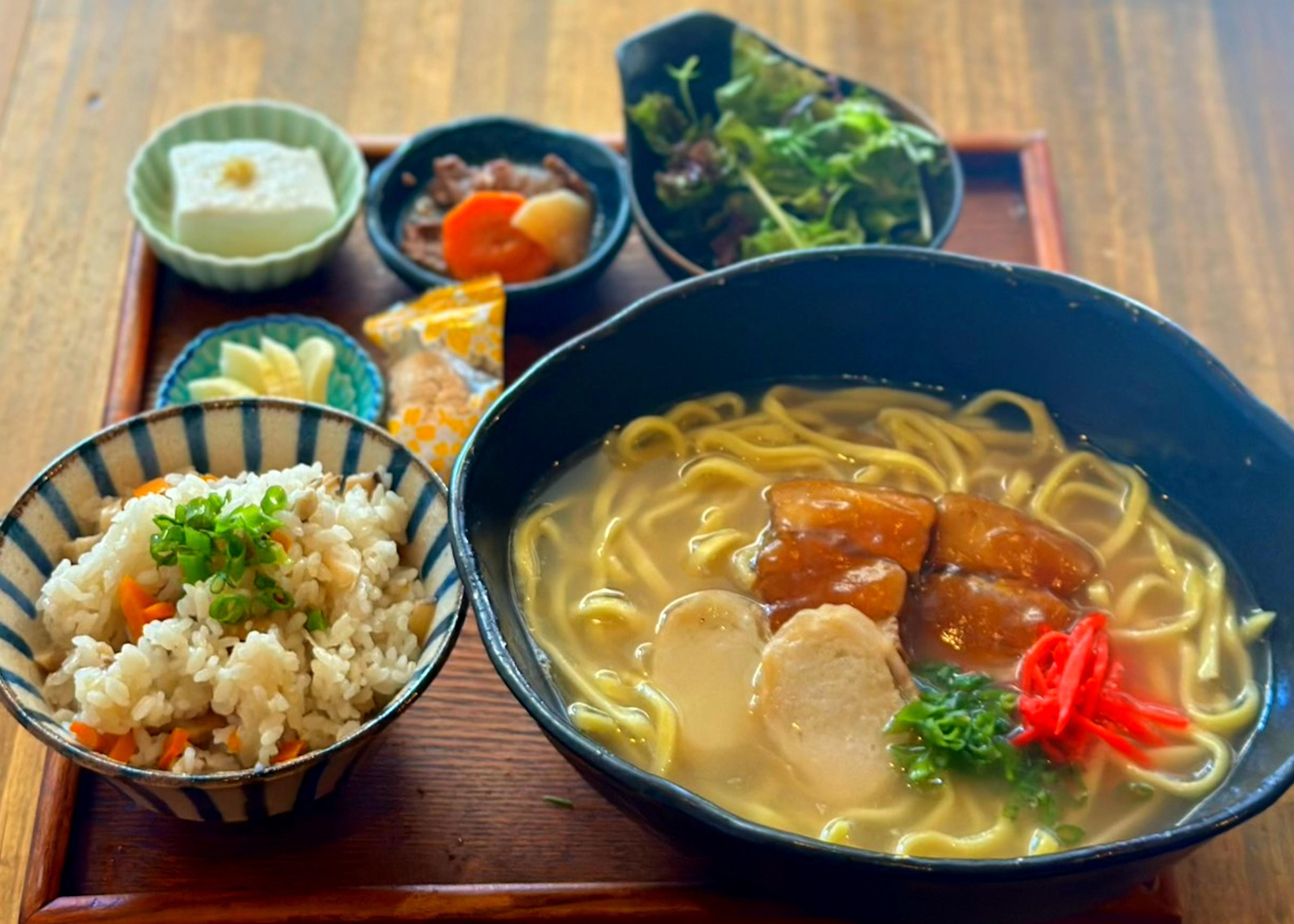 沖縄そばとジューシー定食(サラダ、お新香、小鉢2個、ちんすこう): 950円(税込)