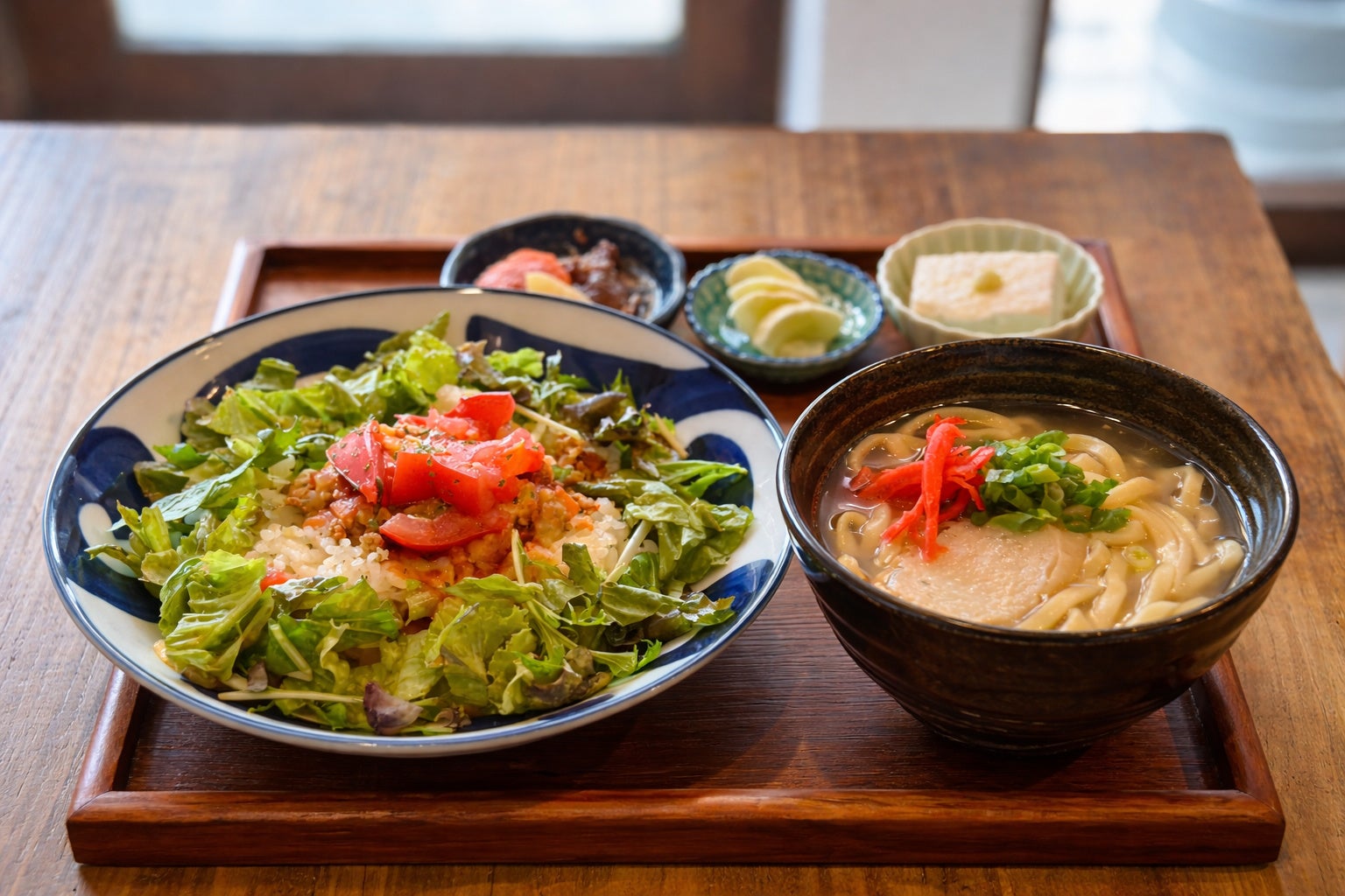 沖縄人気グルメ定食、タコライス・ジューシー・沖縄そば