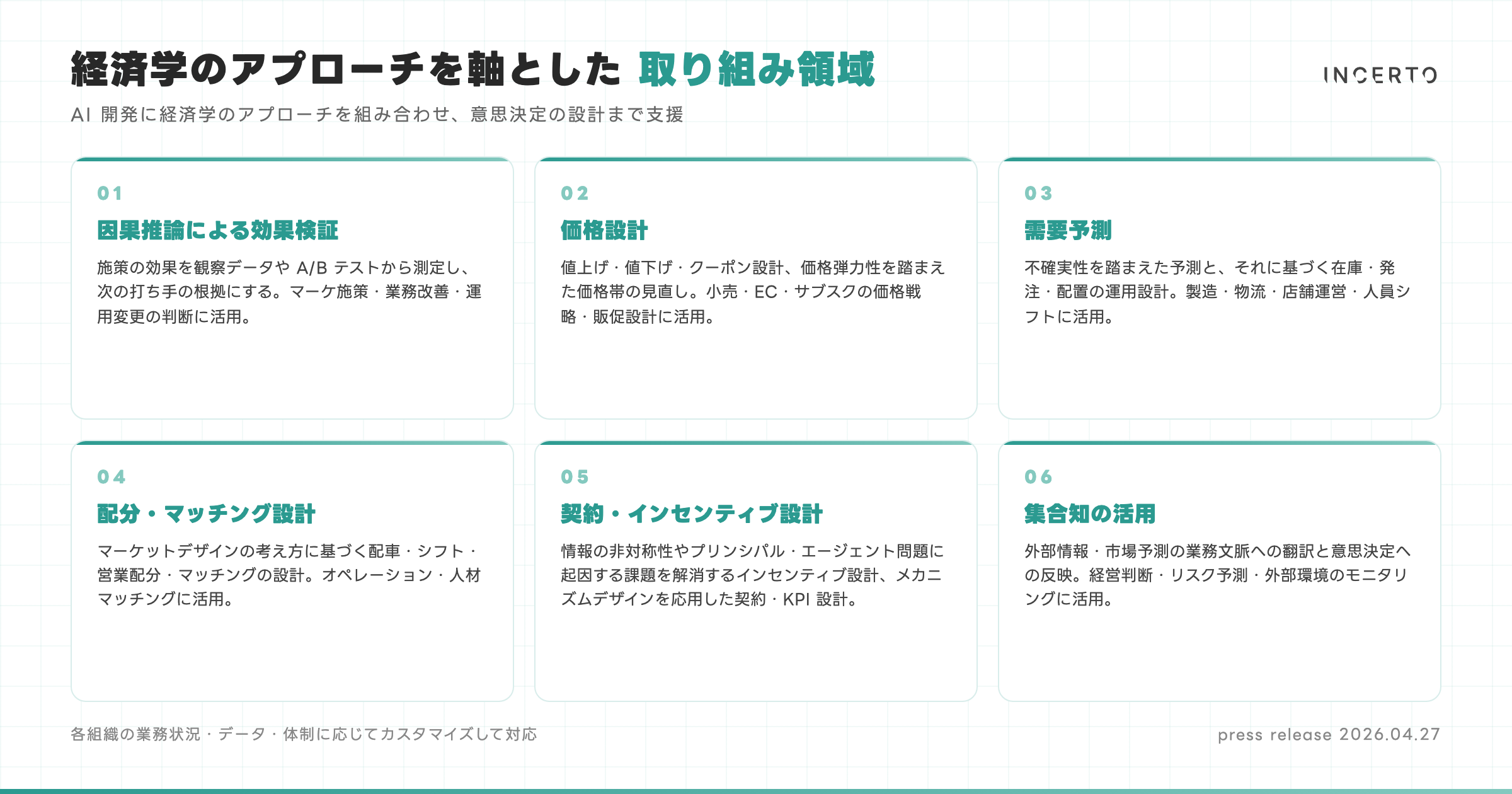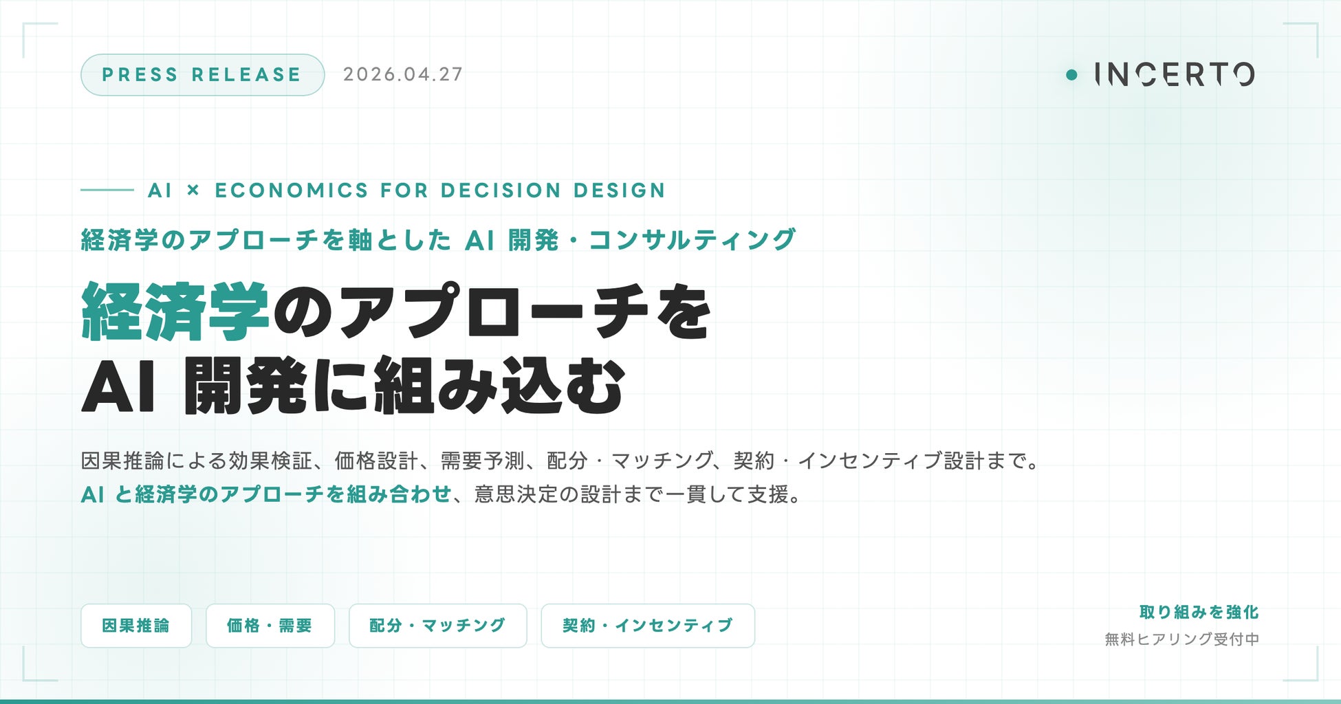 Incerto はこれまで AI 開発・コンサルティングを通じて、文書処理自動化、業務効率化、AI エージェント導入など複数の業種・業務に対する実装支援を行ってまいりました。今回の取り組み強化は、こうした既存の業務に、経済学が扱ってきた領域( 因果推論、価格設計、需要予測、配分・マッチング、契約・インセンティブ設計など )を組み込む形で進めます。