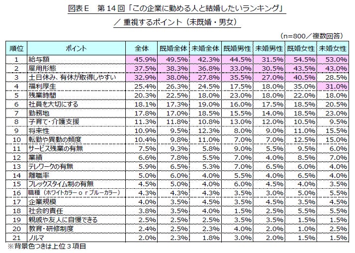 未婚・既婚別では、「給与額」や「土日休み、有休が取得しやすい」において、既婚者(各同49.5%、38.0%)の方が未婚者(同42.3%、27.8%)より高いことから、既婚者は、家族の存在によって結婚相手の給与や休暇を重要だと感じていると考えられます。(図表E)