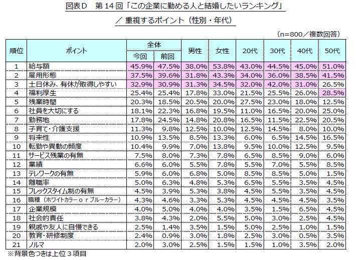 結婚相手の勤務先に対して重視するポイントは、男女、世代問わず「給与額」が1位、次いで2位「雇用形態」、3位「土日休み、有休が取得しやすい」となりました。