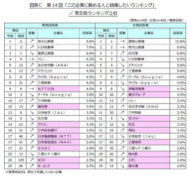第14回「この企業に勤める人と結婚したいランキング」調査結果を発表