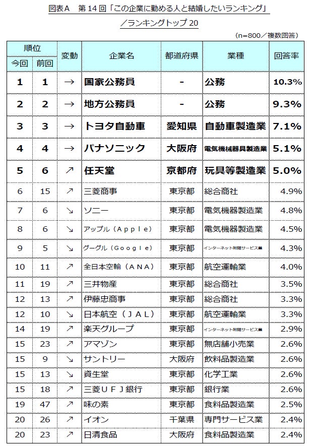 一方、女性が男性に望む勤務先は、1位は「国家公務員」(同13.8%)、2位「地方公務員」(同8.8%)、3位「任天堂」(同6.8%)、4位「トヨタ自動車」(同6.5%)、5位「パナソニック」、「三菱商事」(各同5.8%)となりました。