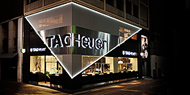 〈エスパス タグ・ホイヤー 心斎橋〉(http://www.tagheuer.co.jp/shop/tagheuer_shop/)は、創業150周年を目前に控えた2009年に、その布石としてオープンしました。外観は〈エスパス タグ・ホイヤー 銀座〉と同様に、アヴァンギャルドなステンレス スティールのファサードが、ブラウンの高級感あふれる壁面を覆うという大胆なもので、関西の伝統と独自のストリートカルチャーがクロスするエネルギッシュな心斎橋の街並みに調和しています。