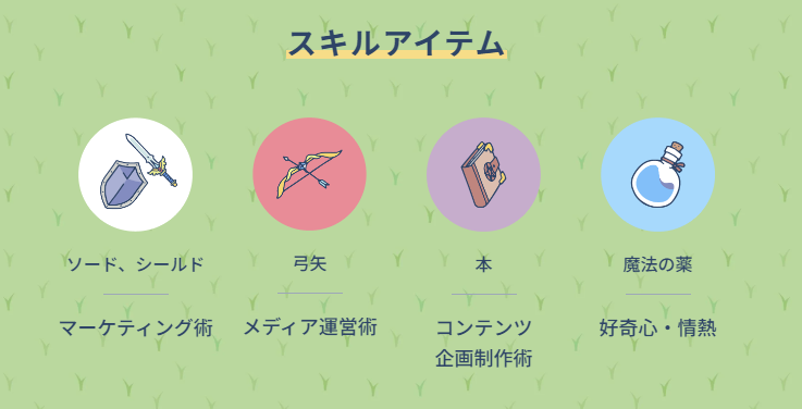なるべく多くの「スキルアイテム」を手に入れ、コンテンツマーケティングの達人「コンテンツマスター」を目指しましょう。