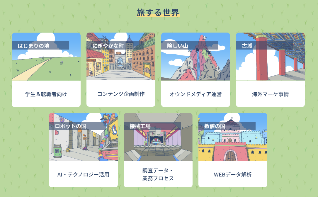 これからマーケティングの世界へ足を踏み入れる方向けの「はじまりの地」から、オウンドメディア運営の裏側に迫る「険しい山」まであります。もちろん、好きな世界から冒険を始められます。