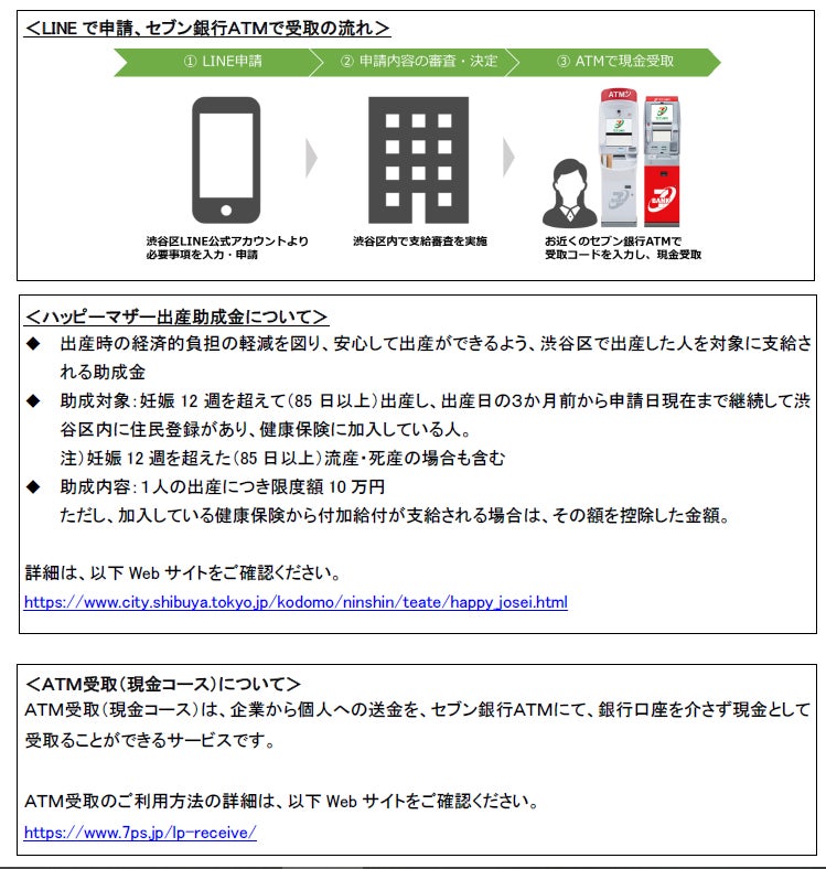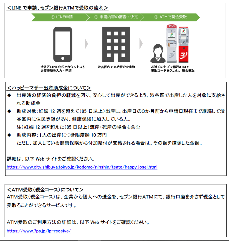 今回の実証実験では、総申請数の約25%が「LINEで申請」、そのうち約20%が「セブン銀行ATMで受取」を選択いただきました。さらに、「ATMで受取」を選択された方のうち約40%は、里帰り出産などの理由でお住まいの渋谷区外にあるATMをご利用されていることや、土日を含めた幅広い時間帯で給付金の受取がされていたことがわかりました。また、アンケート結果では、「出産前後に区役所で手続きする必要がないのは助かる」「都合のよいときに助成金申請ができて便利」など、前向きなご意見もいただきました。こうした結果を踏まえ、当初の目的であった「いつでも、どこにいても助成金を受け取れる」という点で、本施策が区民の皆さまにとって利便性の高いサービスとしてご利用いただけたとの認識です。