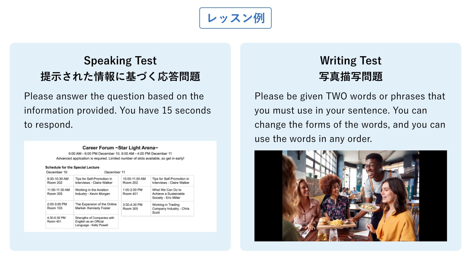 学習コンテンツにおいては、最新の出題傾向を研究し、TOEIC® S&Wテスト対策を熟知した外国人講師の監修によるオリジナル問題を制作しました。また、問題に使用する写真や音声も高品質なものを利用し、本番の試験を想定したレッスンを受けられるようにしています。