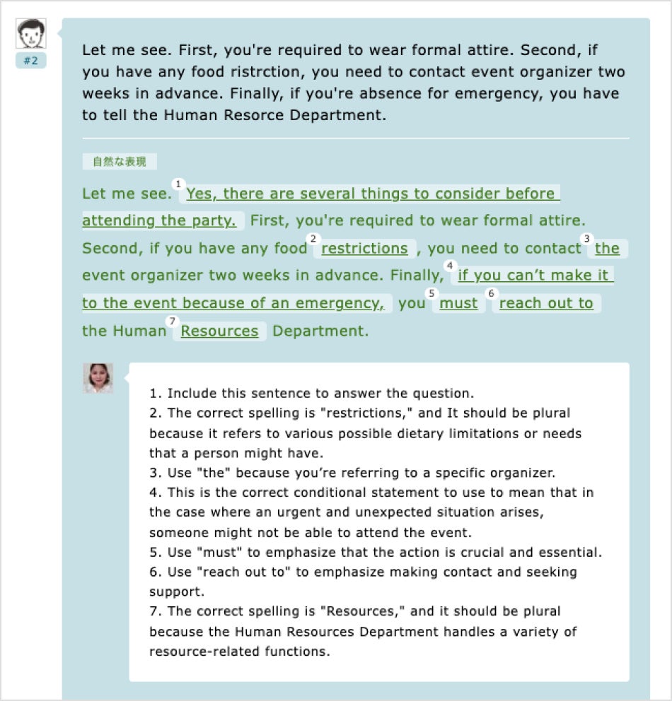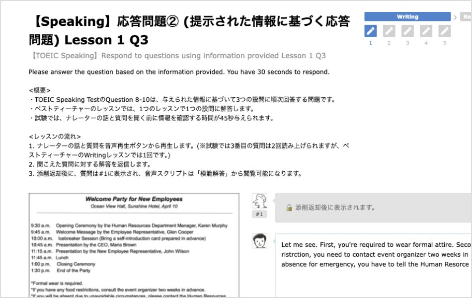 外国人講師による添削後には、問題の音声スクリプトや模範解答を確認でき、講師の添削内容と合わせて、レッスン中や復習時の学習効果をさらに高められるようになります。