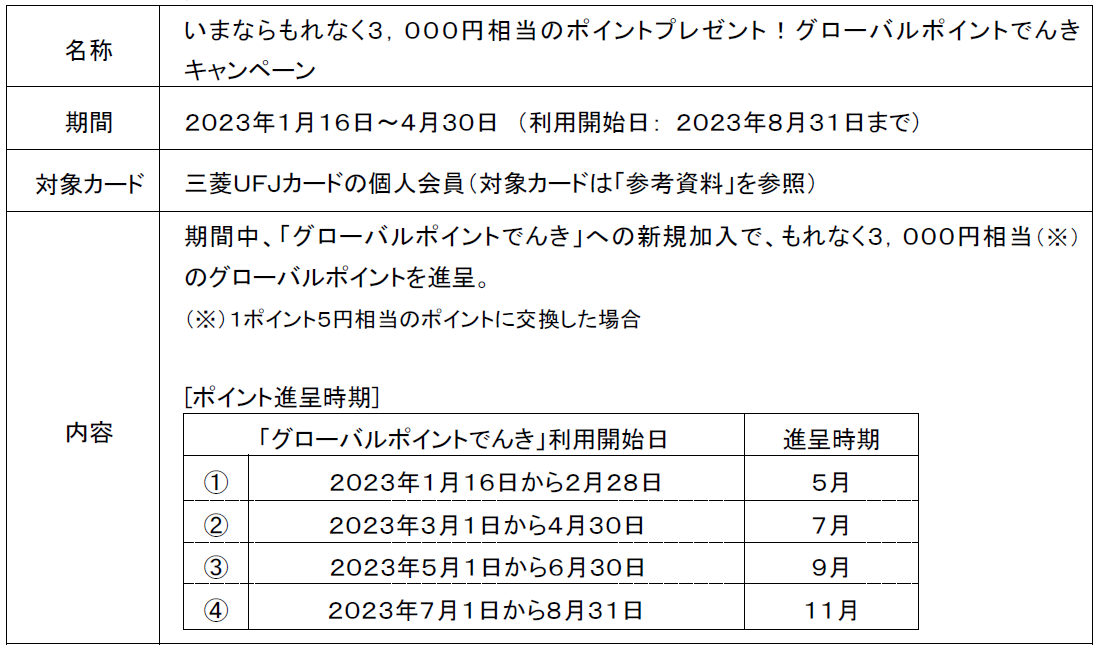 三菱UFJニコスは1月16日から4月30日まで、三菱UFJカードの個人会員向け優待特典「グローバルポイントでんき」への新規加入でもれなく3,000円相当のポイントを進呈するキャンペーンを実施します。