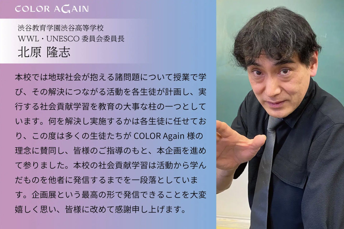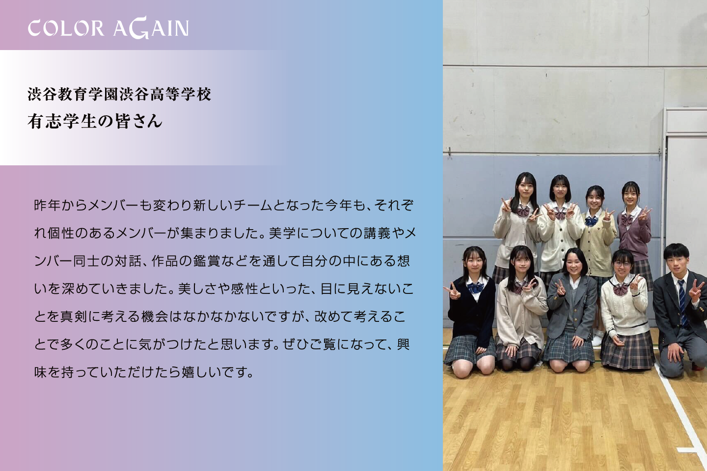 趣旨:COLOR Againのコンセプトのもと、参加する高校生一人ひとりの興味の領域や、気になる社会のテーマなどを掛け合わせながら、 理想的な未来を一人ひとりの視点から自由に発想していく活動の報告と実践