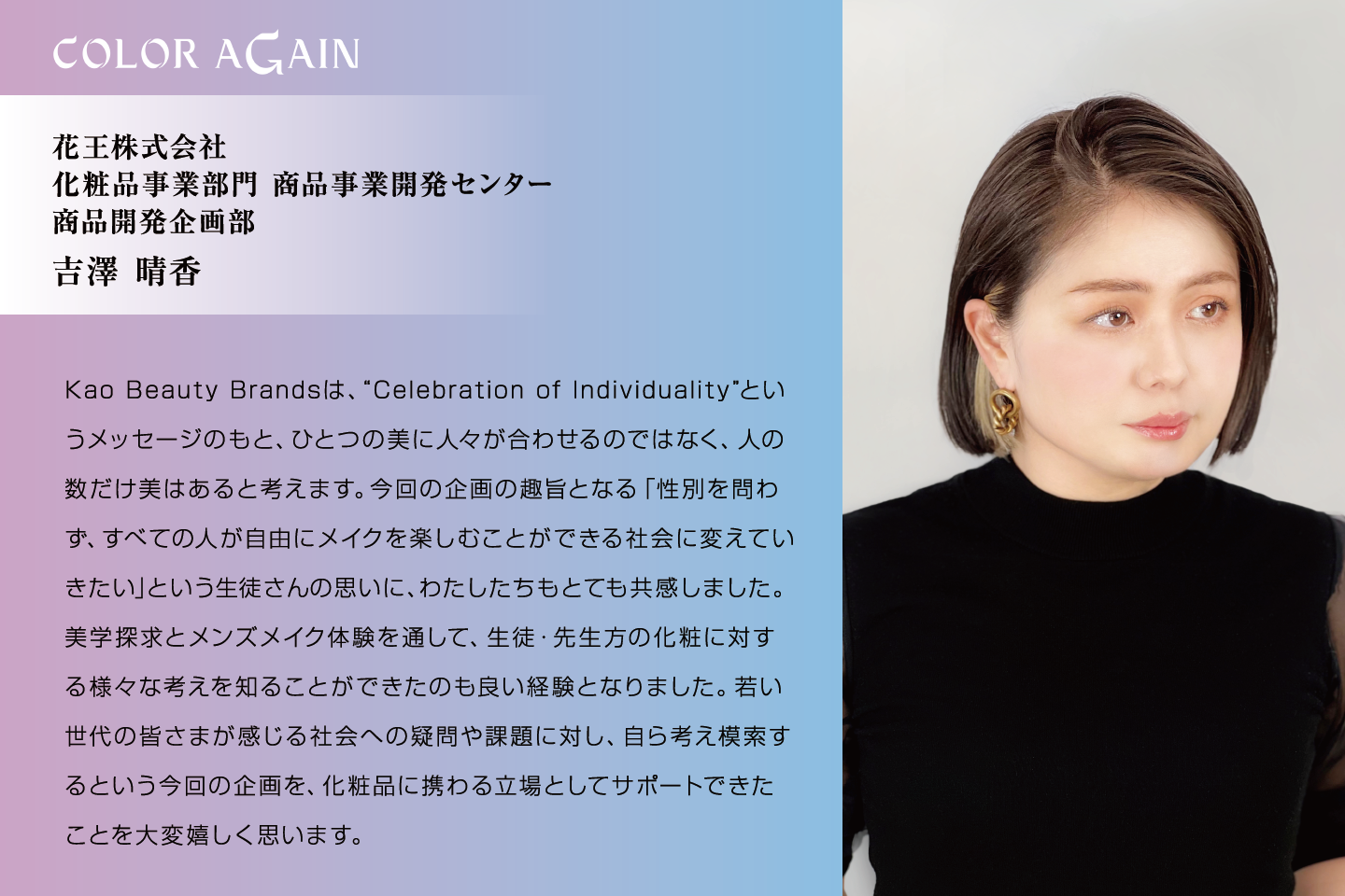 また、メイクの在り方を考える学生の企画に紐付き、化粧品メーカー2社(花王株式会社、資生堂ジャパン株式会社)にご協力いただき、メンズメイク体験を行うだけでなく、そもそも化粧とは私たちにとってどのような行為か、メンズメイクは私たちにどのような影響をもたらし、未来はどのような在り方であることが望ましいか?など対話を重ねました。