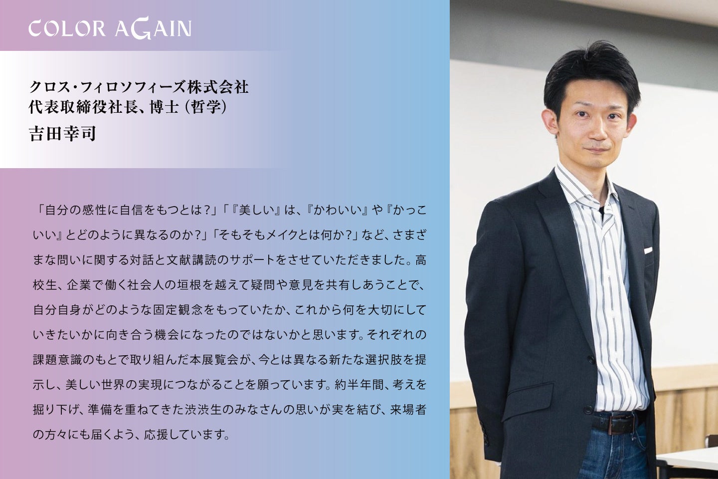 学生の関心分野である、美しさ、コスメ、メイク、ファッション、ジェンダーなどに関わる社会課題に取り組むにあたって、自分の考えを確立するため、哲学者の吉田幸司氏による協力のもと対話を重ね、美学の基礎を学びました。