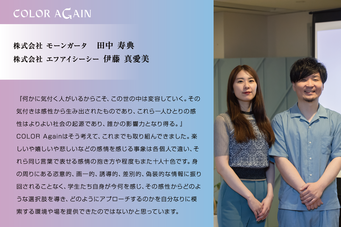 COLOR Againは、2021年よりFICCとモーンガータの2社が中心となって取り組んでいる共同事業で、自分なりの美を再発見する取り組みとして、感性を切り口としたワークショップや探究を行っています。社会によって色あせてしまった個人の色を取り戻し、一人ひとりの可能性や多様性を尊重し合える社会を目指します。
