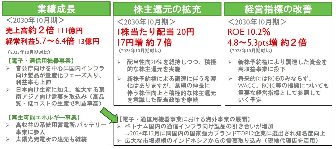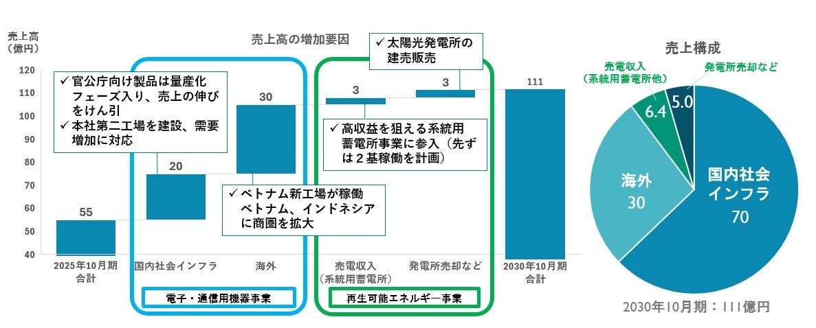 電子・通信用機器事業における官公庁向け製品に対する引き合いは非常に強く、受注製品が量産化フェーズに入ったことに加え、グローバルで防衛意識が年々強まっていることから、この状況は今後も長期にわたり継続すると考えております。当社は、2025年9月に完成したベトナム新工場で、モバイル向け製品の高品質・低コストの生産を実現する一方、国内で生産する官公庁向け製品の需要増加に対応するためには更なる生産能力の拡大が必要であり、2029年10月期には本社第二工場の稼働が必須であると予測しております。
