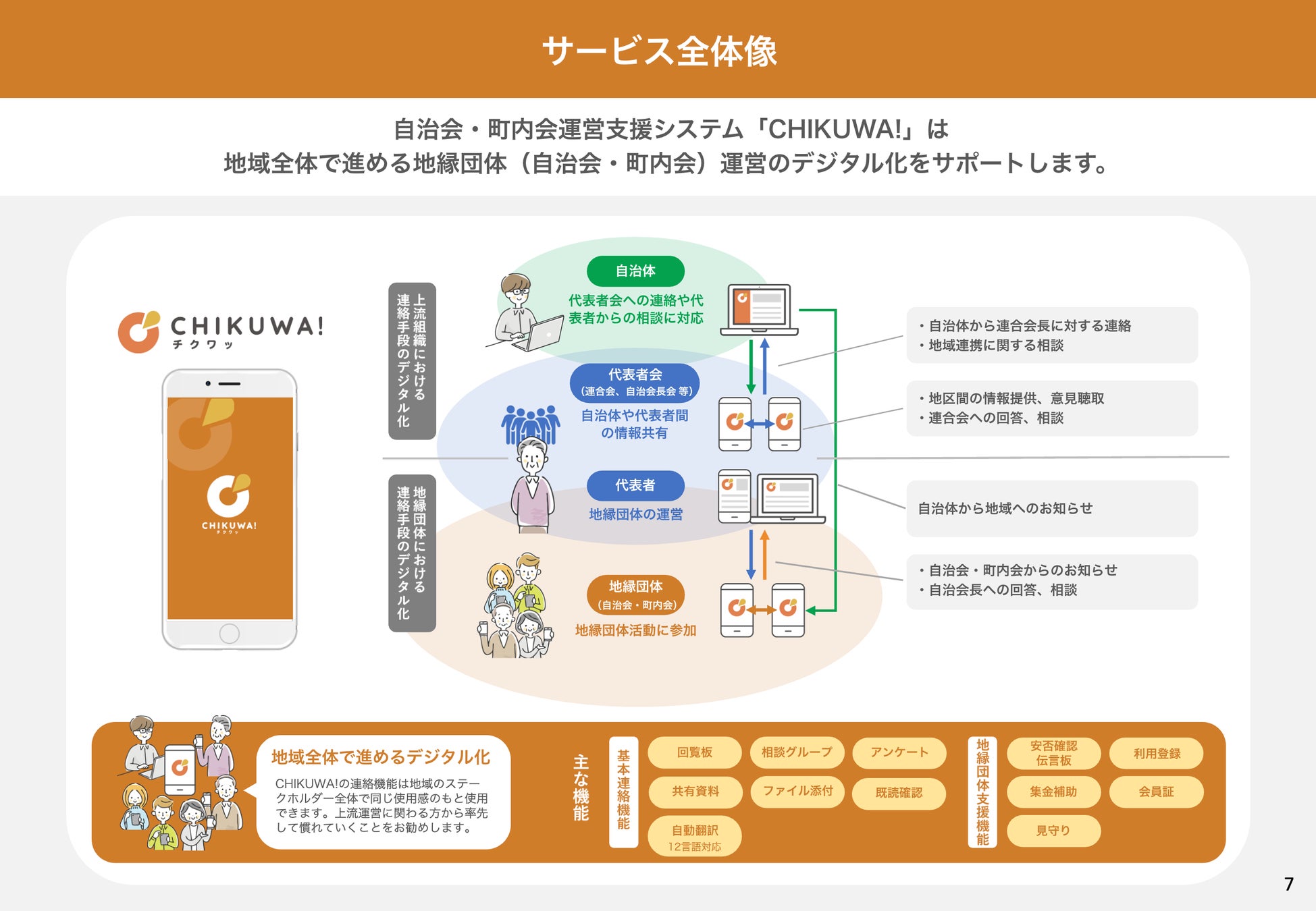 本サービスを利用することで、自治体と自治会・町内会の役員との連絡、オンラインによる回覧板の配布、各種配布資料の管理、多様化する国籍の住民に向けた多言語対応、災害等発生時の緊急情報配信、自治体からのおしらせ一斉配信機能など、運営に必要な機能を取り揃えており、全国の自治体・自治会でご利用いただけます。
