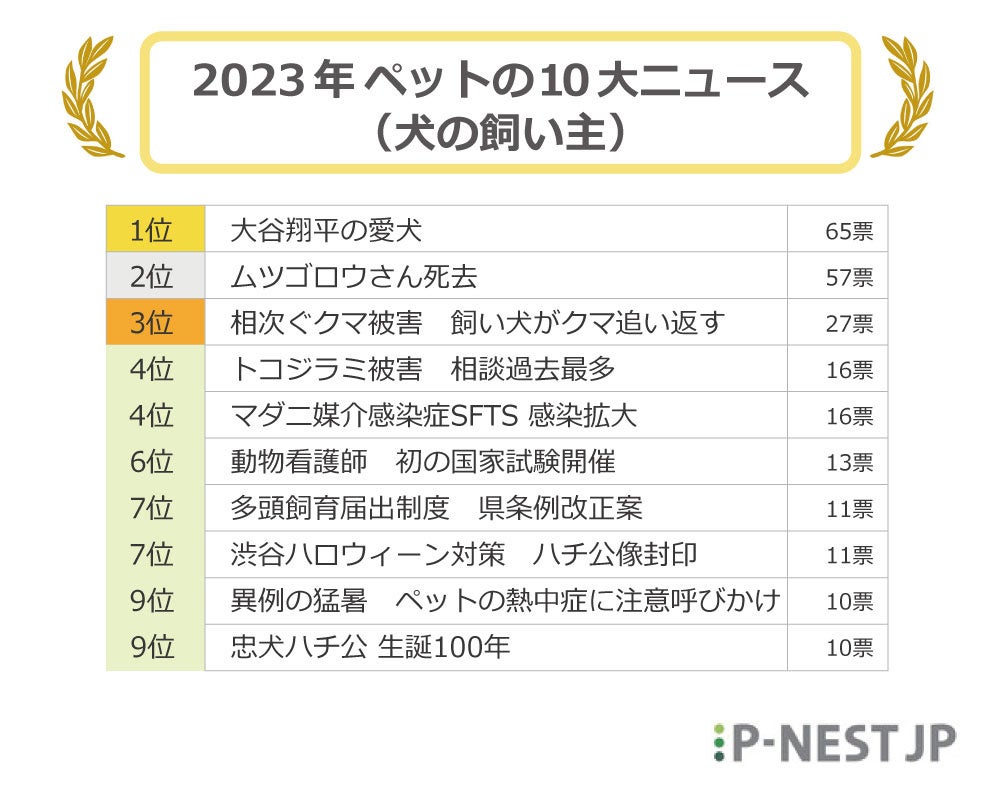 4位〜6位は「クマ被害」「トコジラミ被害」「マダニ媒介感染症SFTS」など、間接的にペットに関わるニュースがランクイン。また8位には「異例の猛暑によるペットの熱中症」のニュースもランクインしており、ペットの健康・安全に関するニュースに関心が集まったようです。
