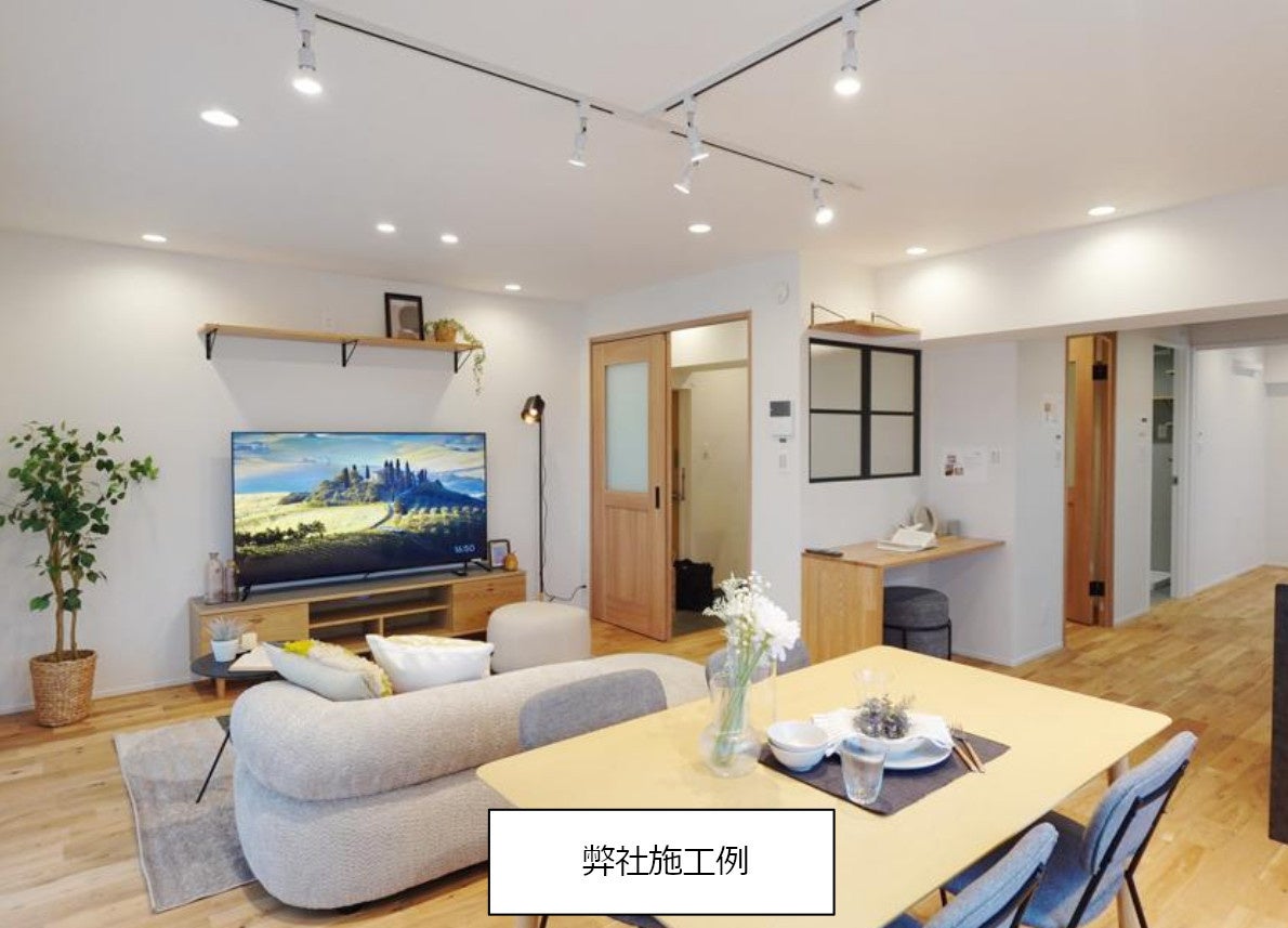 また、内装仕上げを一新し、住宅設備を新しく交換しています。和室だった場所をリビングに間取り変更を行い、キッチンとリビングとの一体感を演出しました。