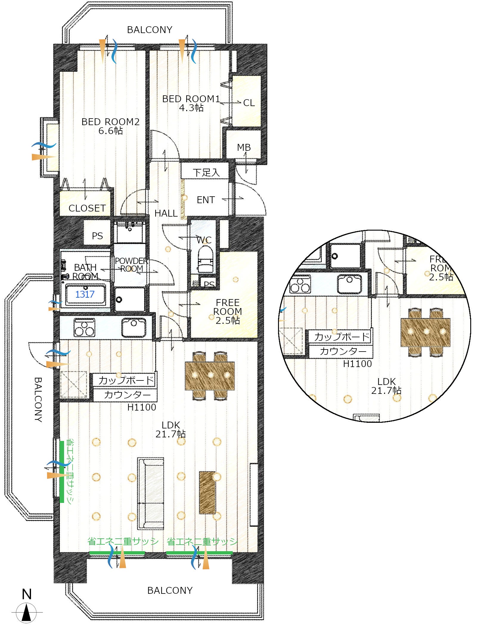 ・バルコニー面積:22.98m2(6.95坪)