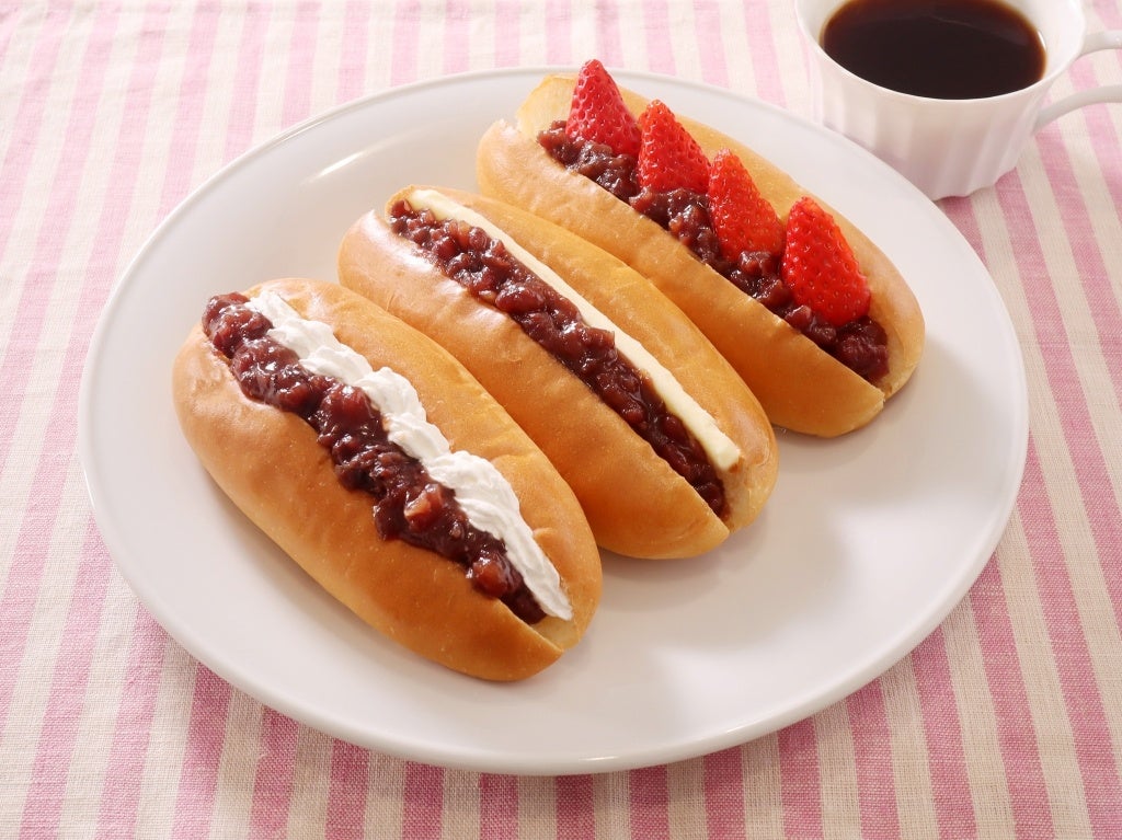 ③ ドックパン1個に切れ目を入れ、ゆであずきの1/3量を入れ、半分に切ったいちごを挟みます。
