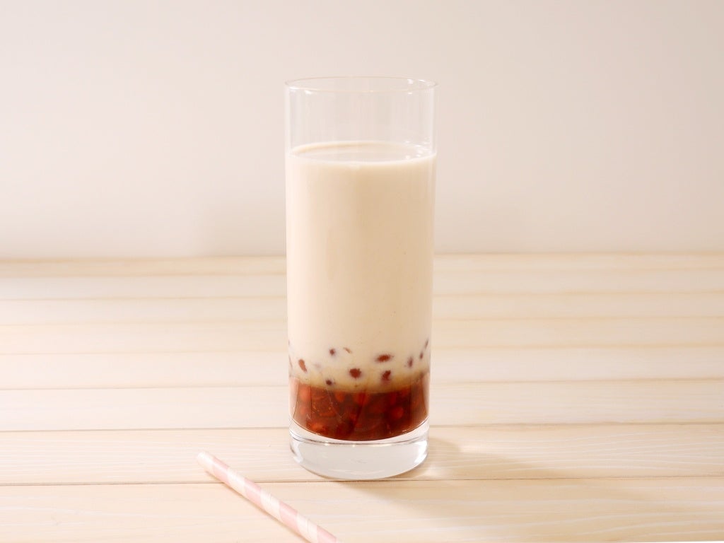 ① グラスに黒糖ぜんざいを入れ、静かに牛乳を注ぎます。