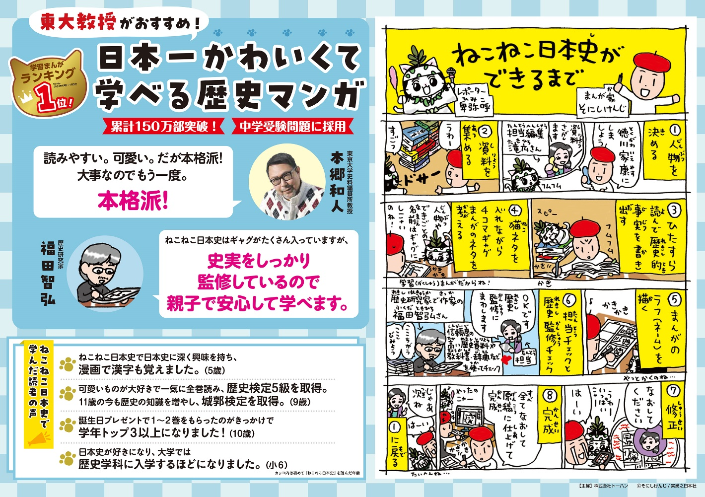 東京大学史料編纂所教授の本郷和人先生が推薦する「ねこねこ日本史」は、なんと中学受験問題にも採用された実績があります。(2022年度大妻中野中学校社会科受験問題採用) 小学生の中でも女子ウケが非常に高く、受験対策本として続々紹介されている、読むだけで自然と歴史が理解できる学習マンガです!