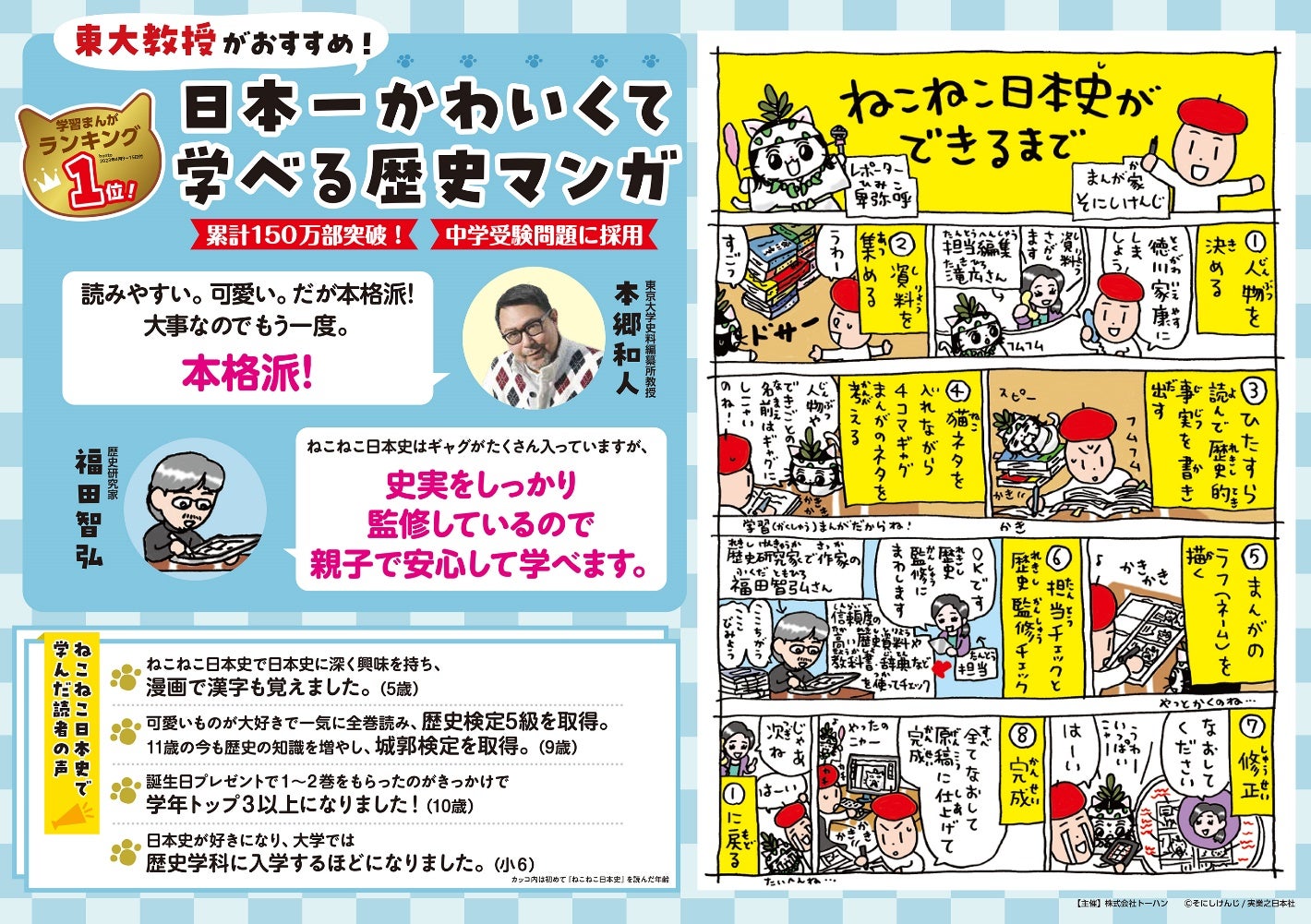 「歴史上の人物が猫だったら」というコンセプトのもと、漫画家のそにしけんじが描く学習マンガ。小学生を中心に人気を呼び、累計150万部を突破。2016~2021年にNHKにてアニメ化、2020年には映画も公開され、現在はYouTube公式チャンネルでアニメ動画を好評配信中。