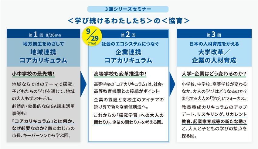 3回を通じて、教育の最前線の動き、企業のこれからの人材育成の動き、それぞれに理解を深め、<協育>を通じて、どんな「接点」を生み出すことができるか、共に考えましょう。