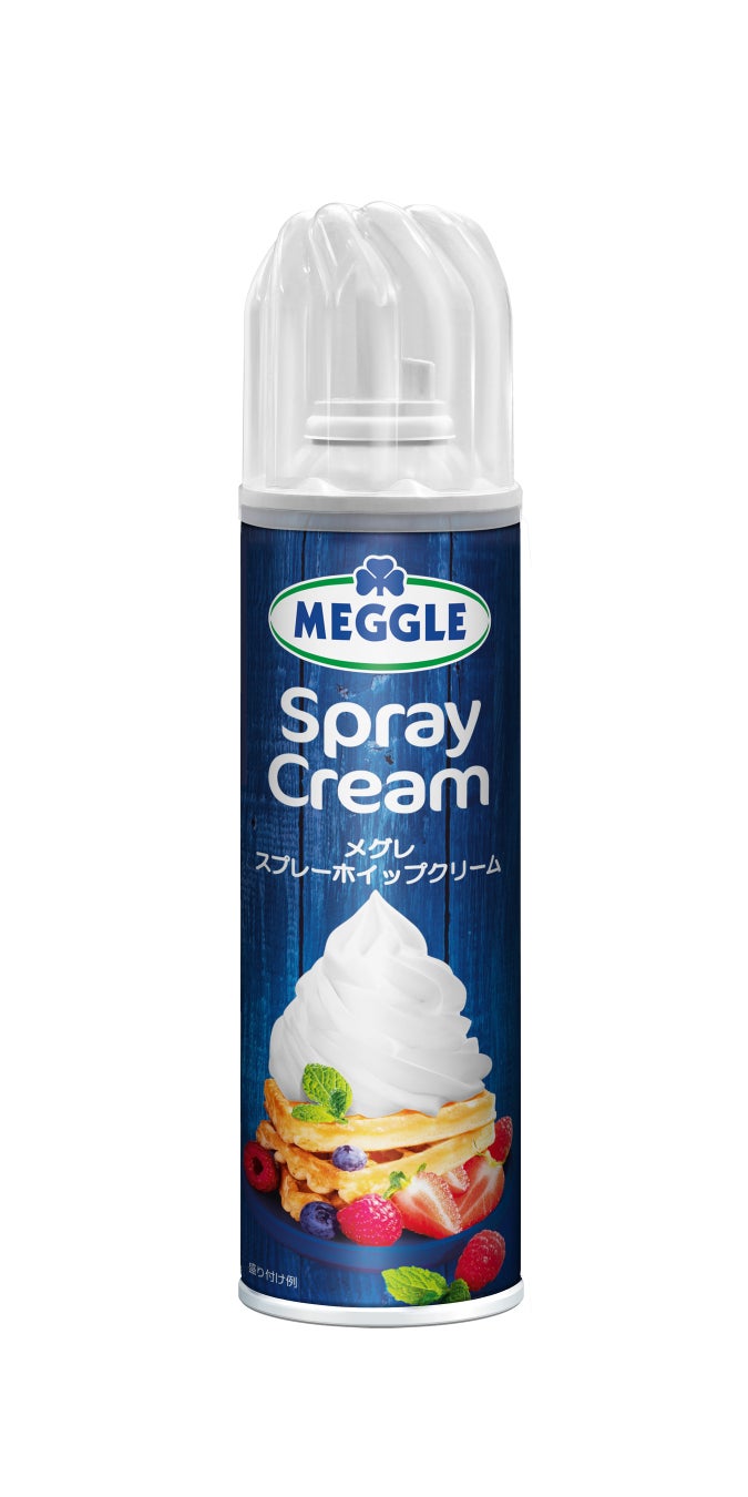 ○メグレスプレーホイップクリームは乳脂肪21%、植物性油脂不使用で牛乳由来の優しい甘さ。