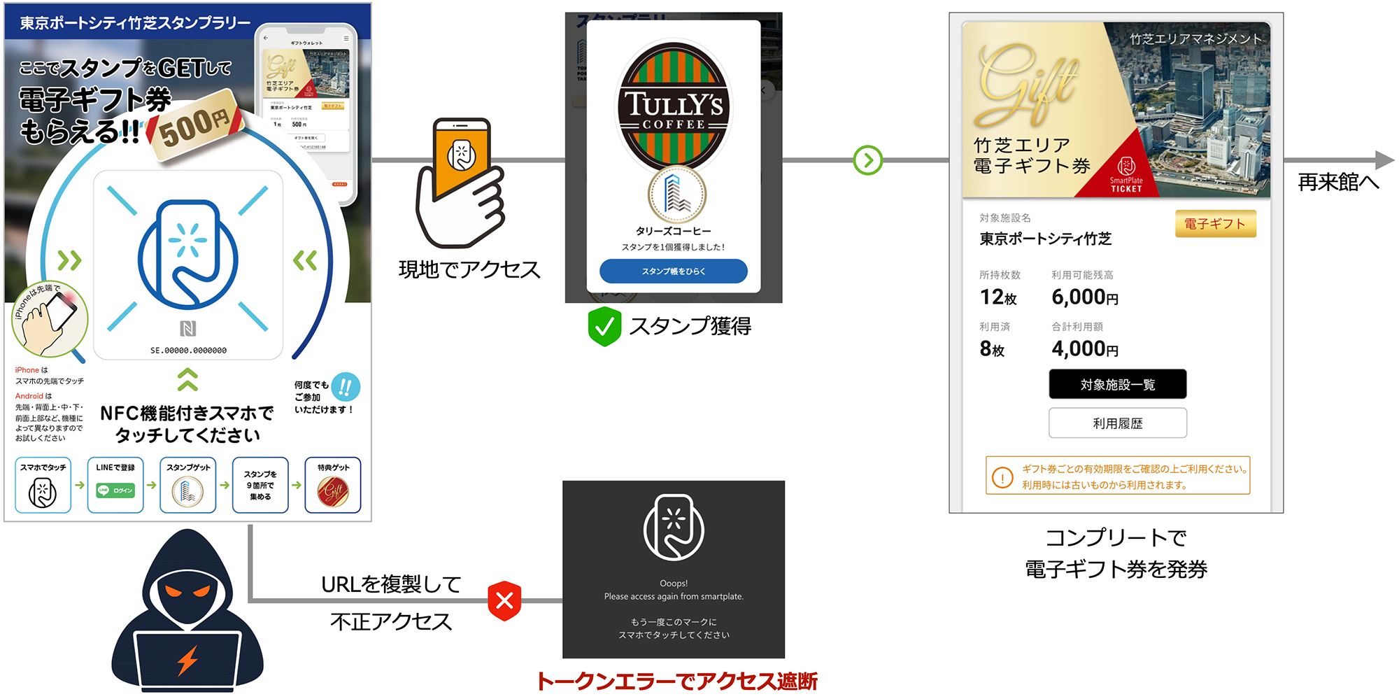 東京ポートシティ竹芝では、スマプレSEでURLの再利用を防止、来店・来館を証明することで付加価値の高い特典提供を可能にした高付加価値提供型のスタンプラリーを実施しています。コンプリート賞品として付加価値が高い電子ギフト券を発券することで参加者の体験価値を向上させ、再来店・店内回遊を促進します。