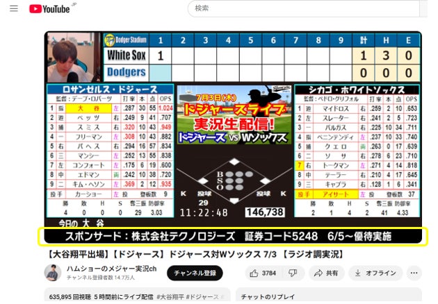 同チャンネルでは、ドジャース戦をラジオ調で実況生配信しています。なお、同チャンネルの登録数 は13.3万人、本年度の1回の視聴数は多い時で147万回再生(平均72.2万回)を記録しています。