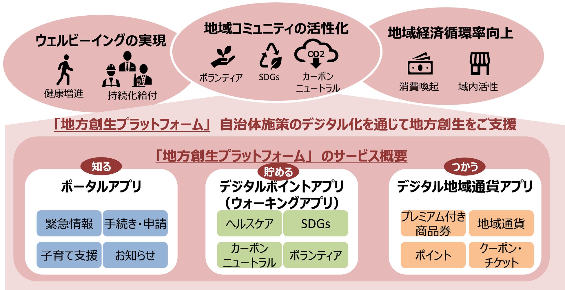 TTDPが提供する「地方創生プラットフォーム」は、プレミアム付きデジタル商品券事業を始め、地域通貨やデジタル地域ポイント、脱炭素化に向けた人々の行動変容、ポータルアプリ等の各事業を1つのアプリで対応し、地方自治体や地域に密着した企業向けに地域活性化や地域のDX化、広域連携を支援するプラットフォームです。