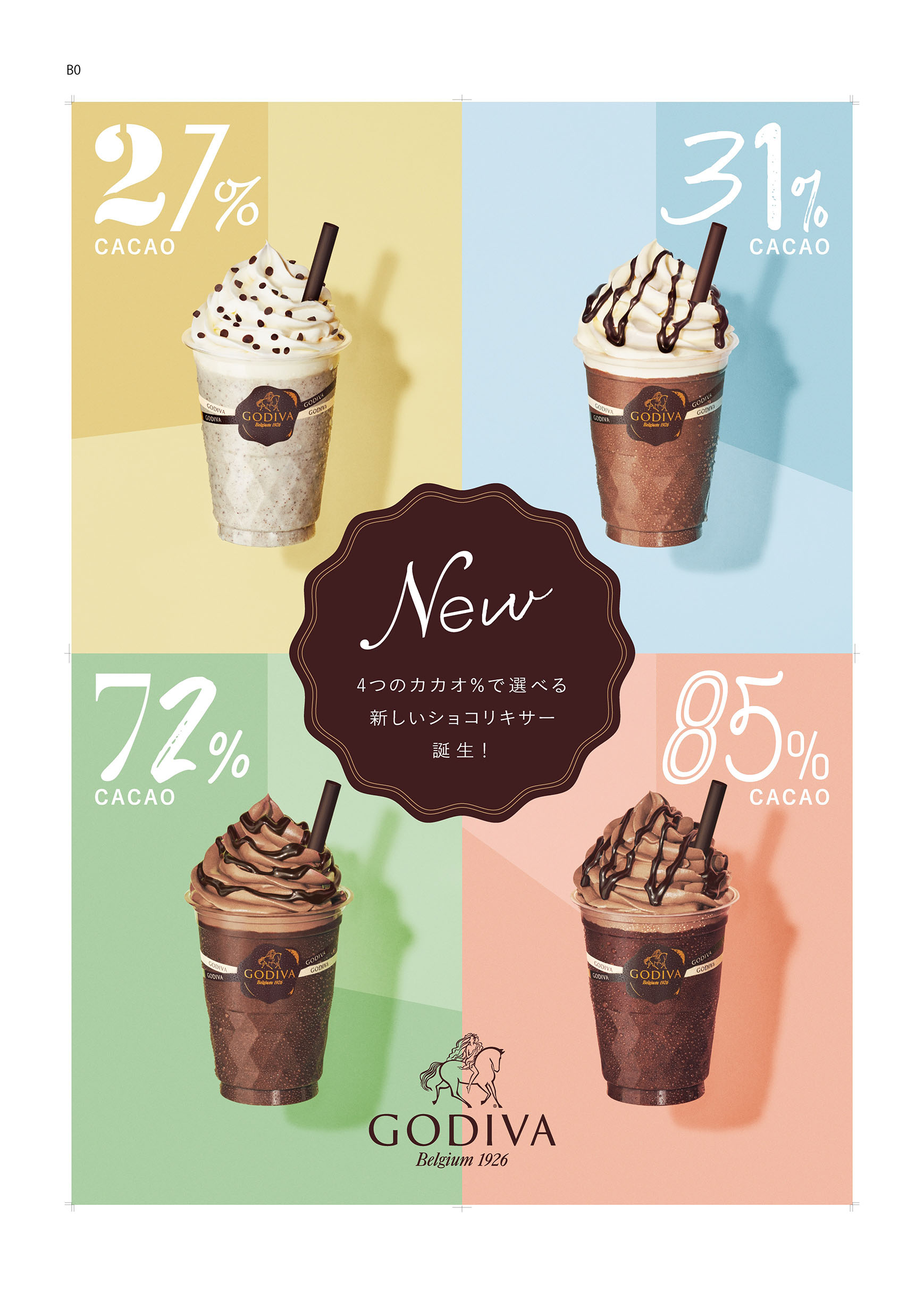 「あなたはどのカカオ%のショコリキサーが好き?キャンペーン」は、濃厚で風味豊かなゴディバのチョコレートを贅沢に使用し、チョコレートに満ち溢れたフローズンドリンクをゴディバシェフのオリジナルレシピで作ったまるで飲むチョコレート「ショコリキサー」を、異なるカカオ%からお好みのフレーバーをお選びいただけるラインナップを中心に、新レシピ全8フレーバーを揃えた、本日4月4日(水)からのリニューアルを記念したキャンペーンです。