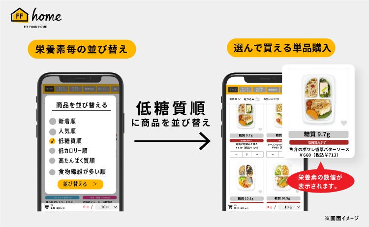 さらに、「並べ替え」機能で栄養素毎に並べ替えができ、トレーニングなどの目的に合わせて「低糖質やたんぱく