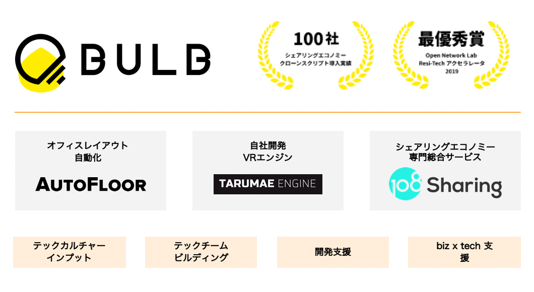 BULB株式会社はスタートアップ企業の開発支援に特化したテクノロジーカンパニーです。これまで不動産テック、飲食テック、シェアリングエコノミーなど多くの事業領域において新規技術チーム構築、プロダクト開発支援、テック戦略立案、PMF支援などを行って参りました。テックとビジネスの橋渡しを行うことで大企業からスタートアップまで企業が直面する課題を解決しています。